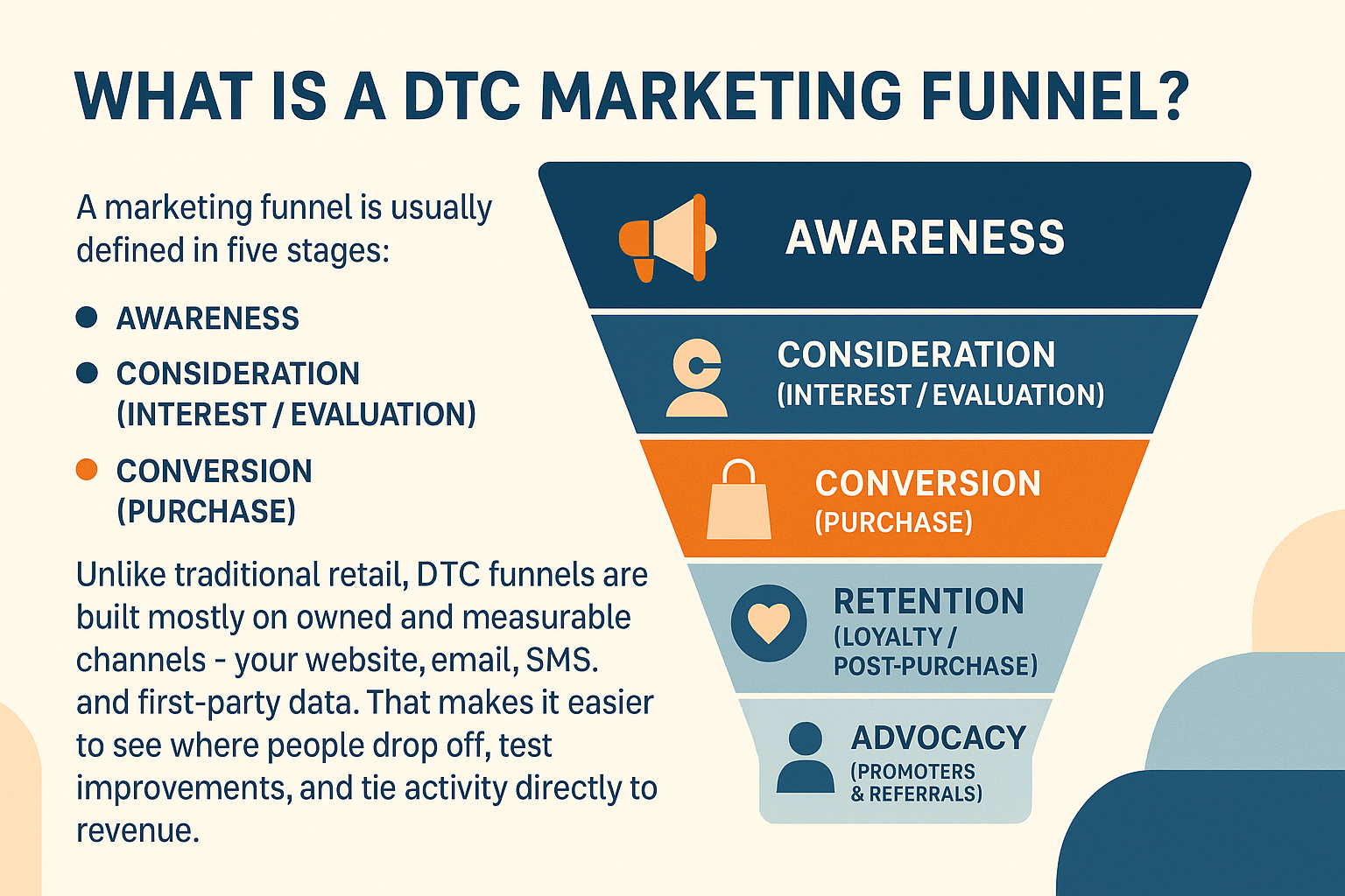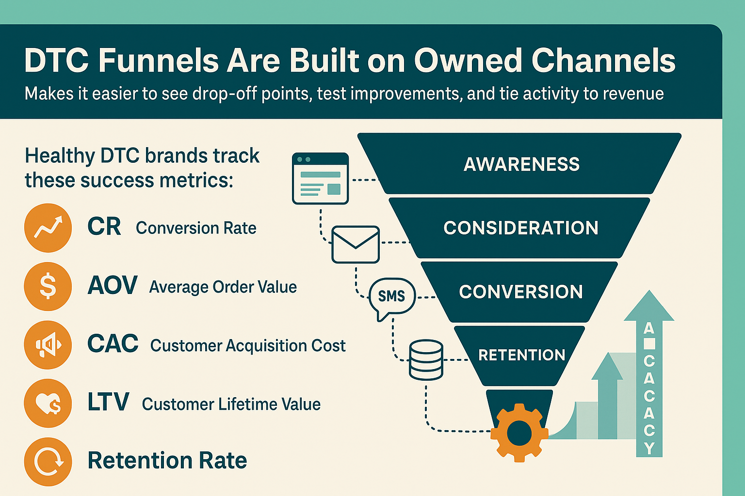 Unlike traditional retail, DTC funnels are built mostly on owned and measurable channels — your website, email, SMS, and first-party data. That makes it easier to see where people drop off, test improvements, and tie activity directly to revenue.