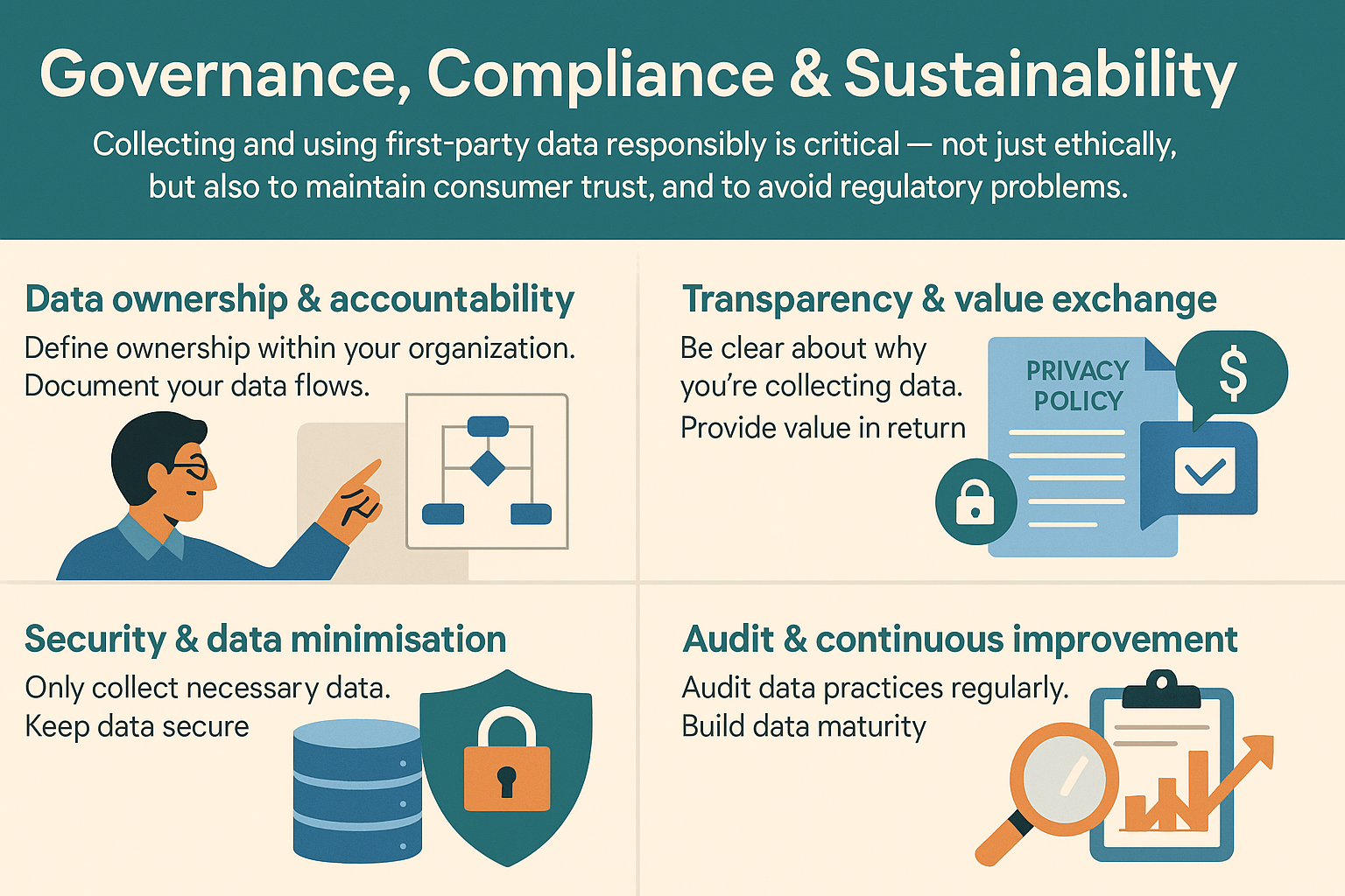 Define ownership within your organisation: Who manages data collection, who manages quality, who handles consent, who oversees audience uploads? A clear owner means better coordination.